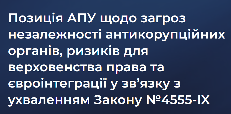 У заяві АПУ наголошується, що ухвалення цього Закону значно послаблює незалежність антикорупційних органів, ставить під загрозу євроінтеграційні прагнення України, а також порушує принципи верховенства права та законності, зокрема через порушення процедур, передбачених Регламентом Верховної Ради України.