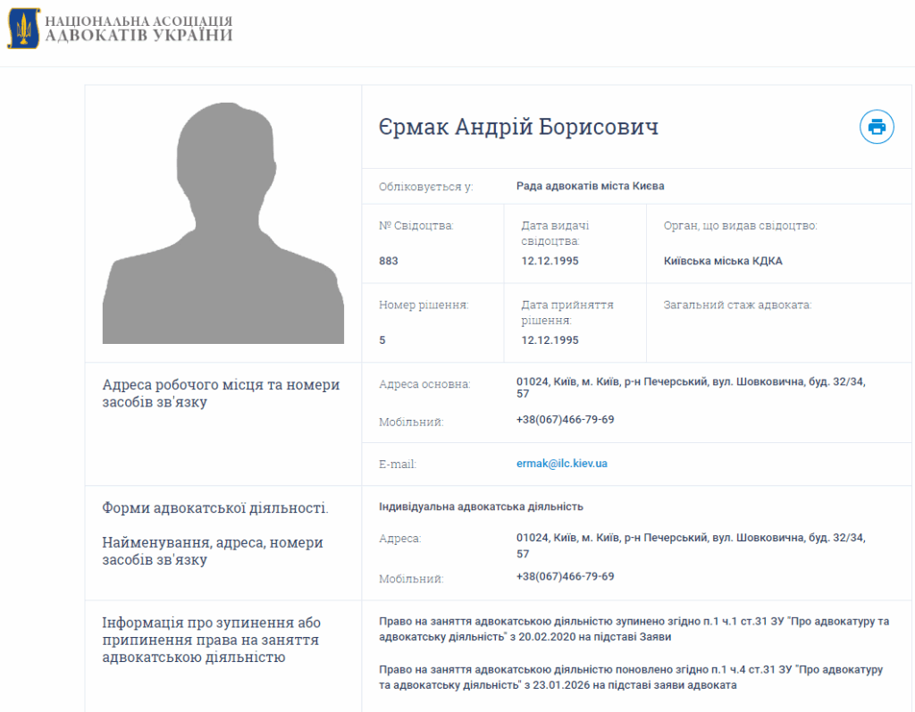 23 січня 2026 року колишній голова Офісу Президента Андрій Єрмак поновив право на зайняття адвокатською діяльністю.