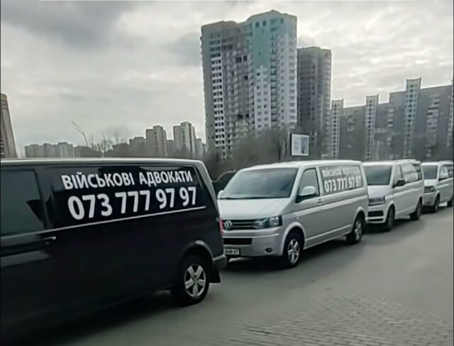 Днями на вулицях Києва можна було побачити дивний кортеж з майже однакових мікроавтобусів з намальованими на бортах написами «Військові адвокати».
