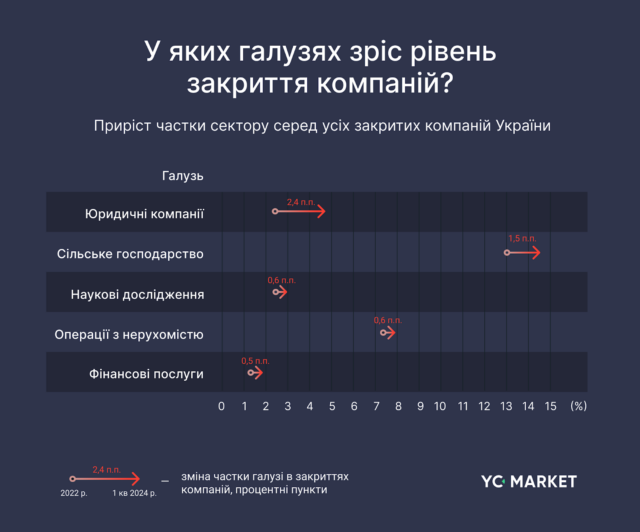 Так, зміна частки закриття юридичних компаній за час війни склала +2,4 п.п. Це означає, що закриття юридичних компаній за час повномасштабної війни зросло вдвічі.
