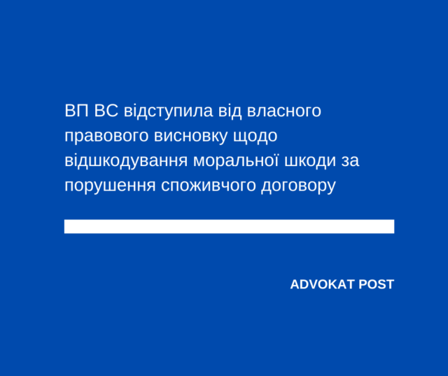 Велика Палата Верховного Суду відступила від власного правового висновку щодо відшкодування моральної шкоди за порушення споживчого договору, визначивши, що,вирішуючи спір щодо відшкодування моральної шкоди за порушення споживчого договору, зокрема, у справі про порушення банком зобов’язання з повернення вкладу, суди мають враховувати, що моральна шкода за порушення цивільно-правового договору підлягає стягненню на підставі статей 16 та 23 ЦК України і статей 4та 22 Закону України «Про захист прав споживачів» навіть у тих випадках, коли умовами договору право на компенсацію моральної шкоди не передбачено.
