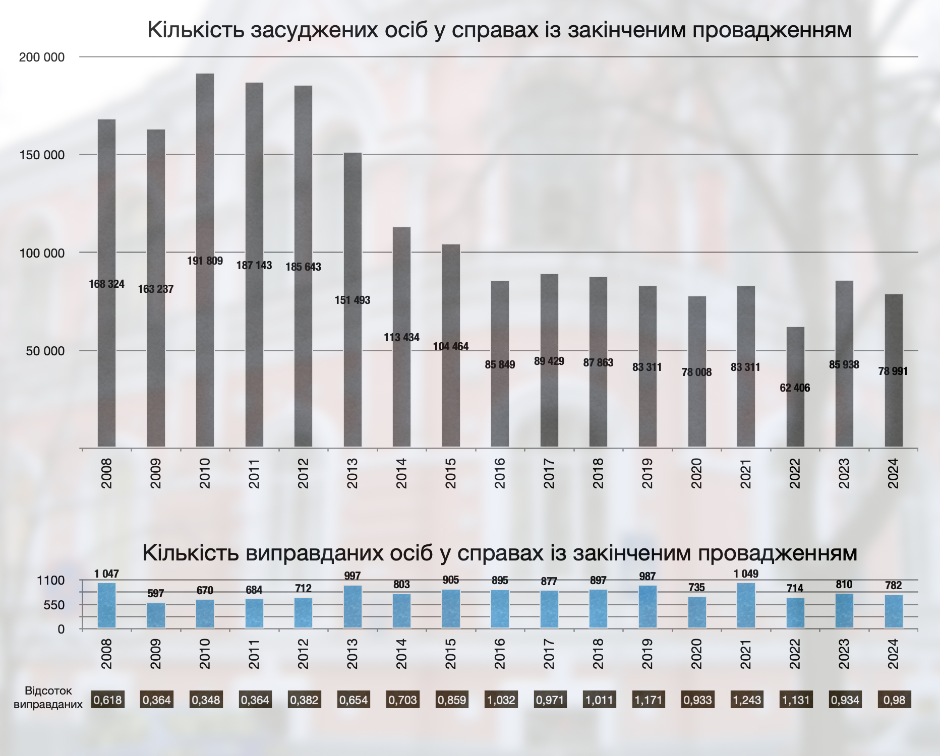 З 2008 по 2024 рік кількість осіб, яких визнали невинними, щороку коливалась у межах від 597 до 1 049. За цей самий період суди щороку визнавали винними від 62,4 до 191,8 тис. осіб. І частка осіб, виправданих у справах із завершеним провадженням, рідко коли перевищувала 1 %.