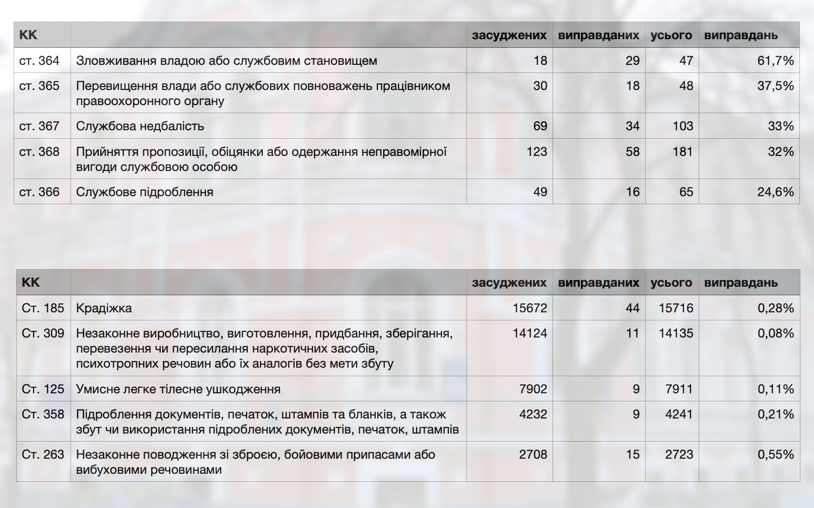 Але загальний низький відсоток виправдувальних вироків не повною мірою відображає реальний стан правосуддя. Більш цікавим є детальний аналіз судової статистики у розрізі статей Кримінального кодексу, який дозволяє виявити певні закономірності.