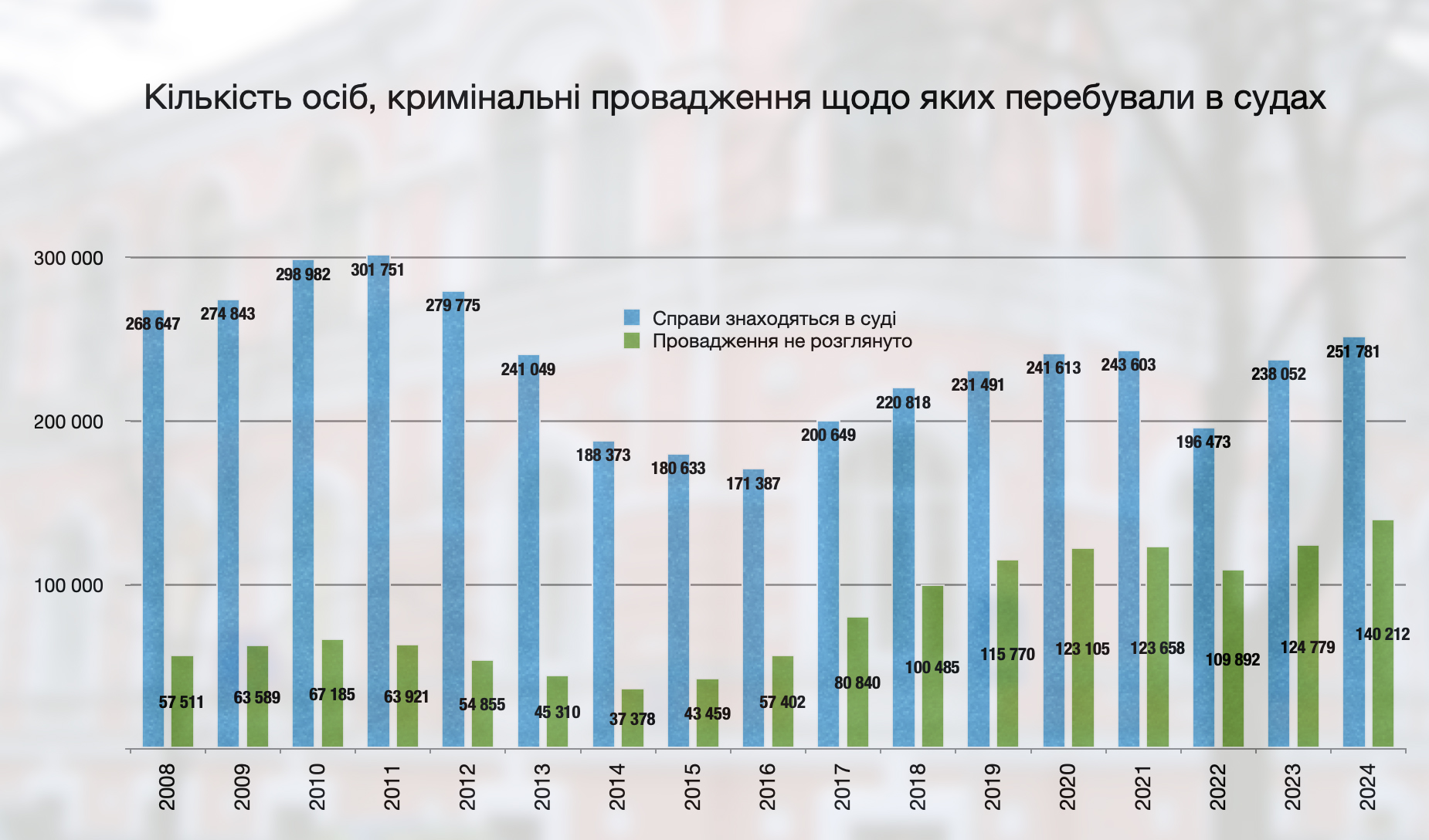У середньому протягом 2008–2014 років нерозглянутими залишалися справи щодо 50–70 тисяч осіб щорічно. З ухваленням нового КПК після 2012 року цей показник певний період падав. Але починаючи з 2015 року, ця цифра почала знову поступово зростати, а після 2018-го — різко пішла вгору.