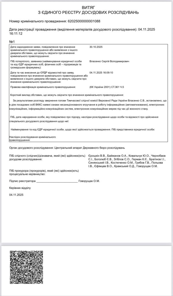 Голова Тимчасової слідчої комісії з розслідування фактів можливої корупції у правоохоронних та судових органах, зокрема в прокуратурі, поліції, СБУ, ДБР, НАБУ та судах Сергій Власенко повідомив про те, що заявою ТСК було внесено в ЄРДР відомості про злочин, здійснений посадовими особами ВККС.