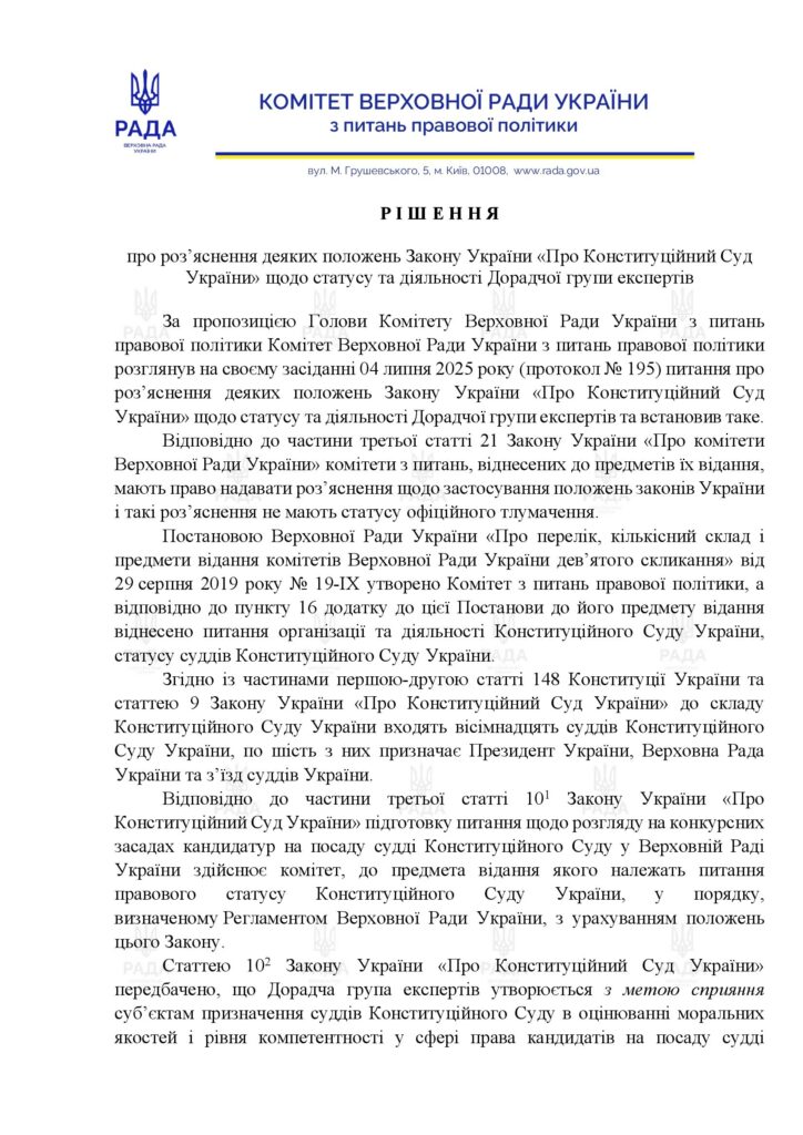 4 липня 2025 року Комітет Верховної Ради України з питань правової політики ухвалив рішення про роз’яснення деяких положень Закону України «Про Конституційний Суд України» щодо статусу та діяльності Дорадчої групи експертів.