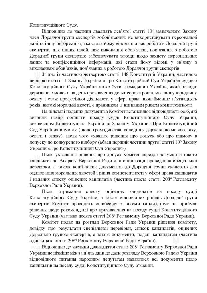 12. Не пізніше ніж за п’ять днів до дати розгляду Верховною Радою відповідного питання народним депутатам надаються всі документи щодо кандидатів на посаду судді Конституційного Суду України.”