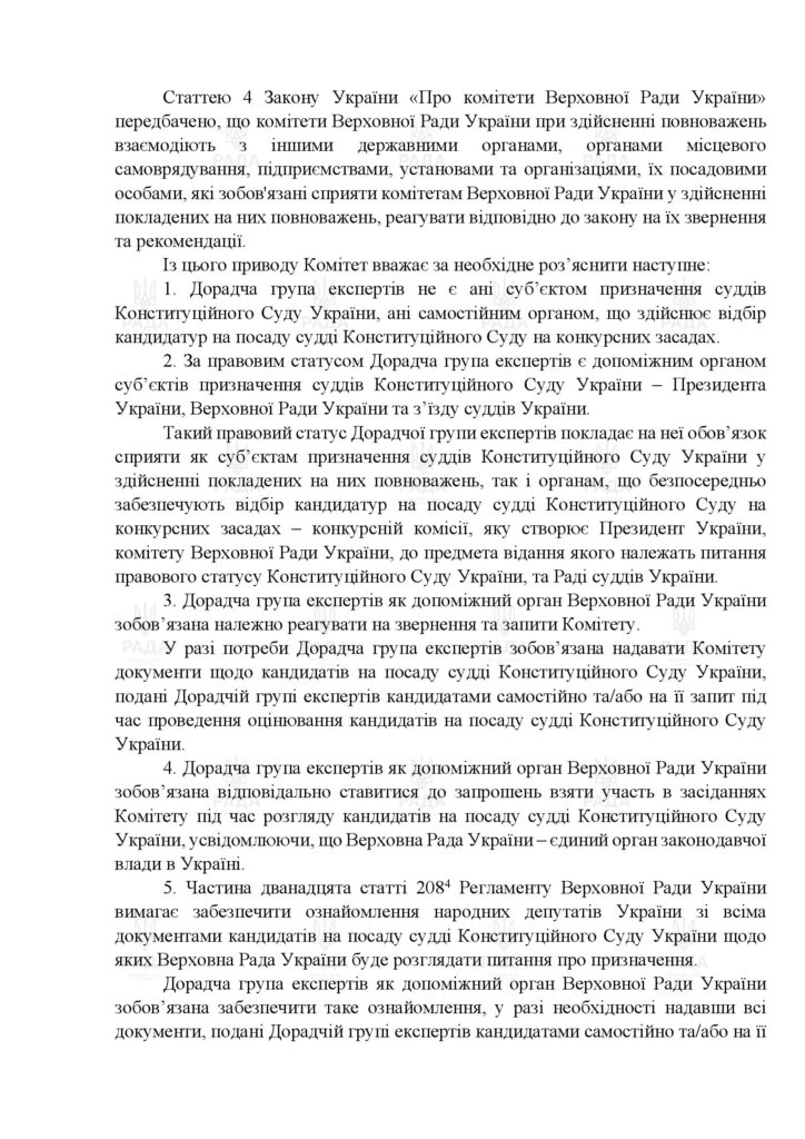 В свою чергу у Комітеті Верховної Ради України з питань правової політики звертають увагу членів Дорадчої групи експертів, що цей орган є допоміжним і він створювався для сприяння призначенню суддів Конституційного Суду України, і саме на Комітет покладаються обов’язки ретельної перевірки кандидатів, а відповідно, Комітет повинен мати доступ до необхідної інформації.