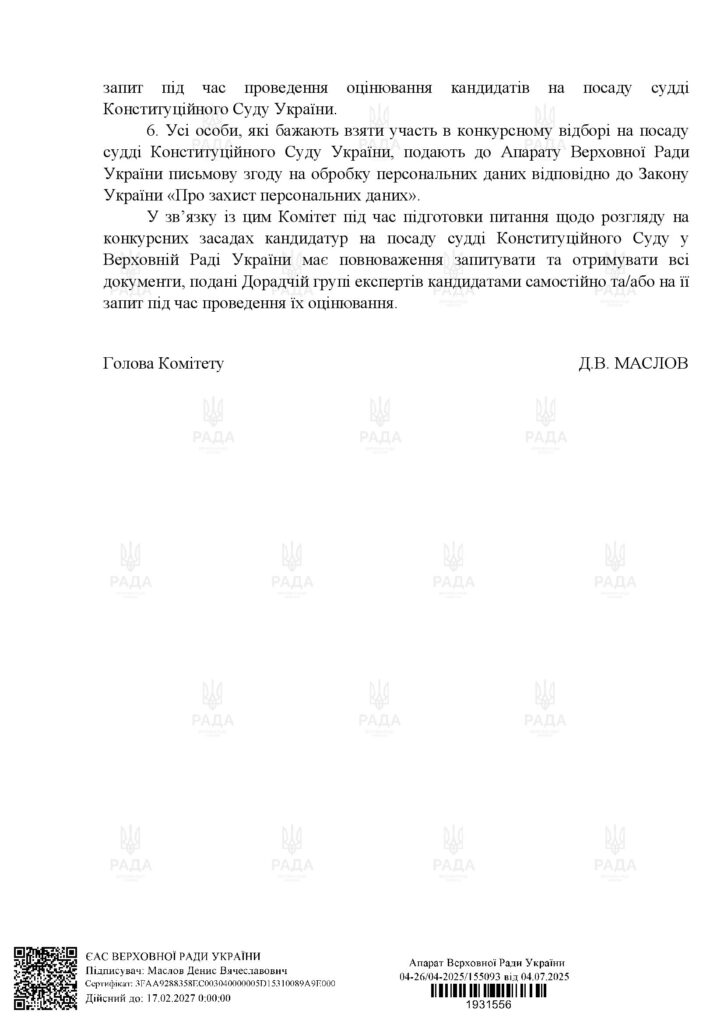 Нагадаємо, що у 2024 році за аналогічних умов Комітет провів співбесіди, а Парламент призначив суддею КСУ Сергія Різника без вимог до ДГЕ про надання непередбачених законом документів. Відповідне законодавство з того часу не змінилося.