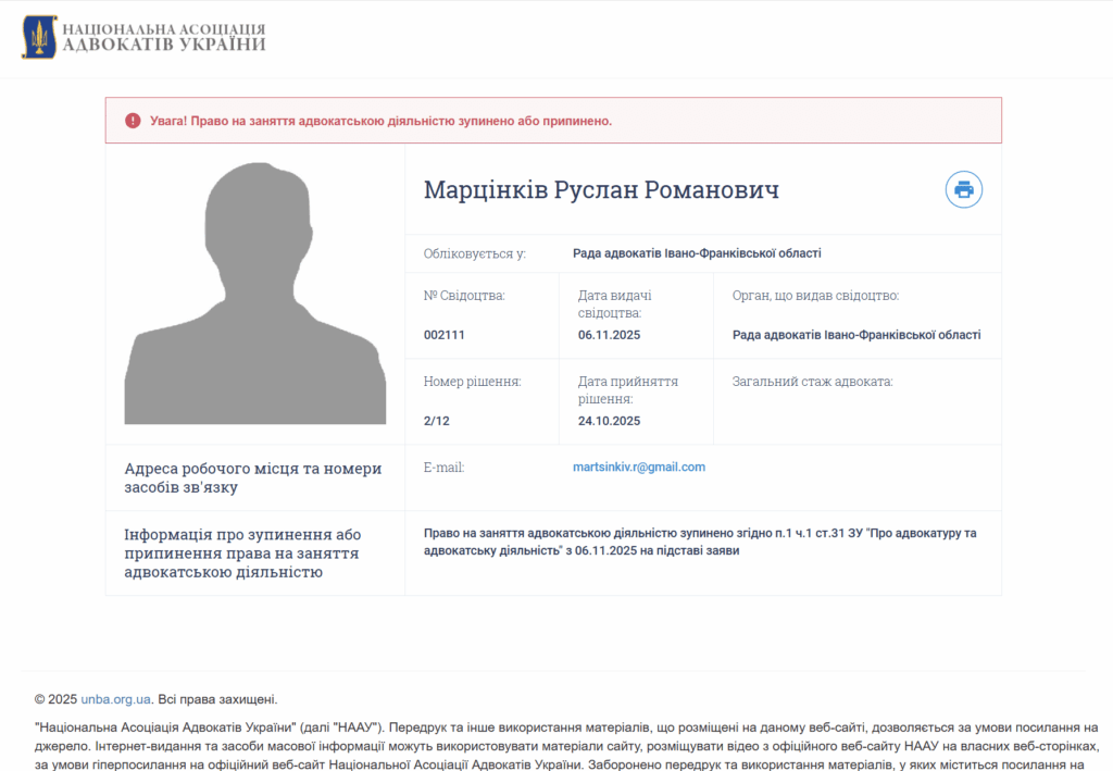 У Єдиному реєстрі адвокатів України на сайті Національної асоціації адвокатів України зазначається, що Марцінків Руслан Романович став адвокатом за рішенням Ради адвокатів від 24 жовтня 2025 року. У якості контакту подано діючу електронну адресу міського голови Івано-Франківська.