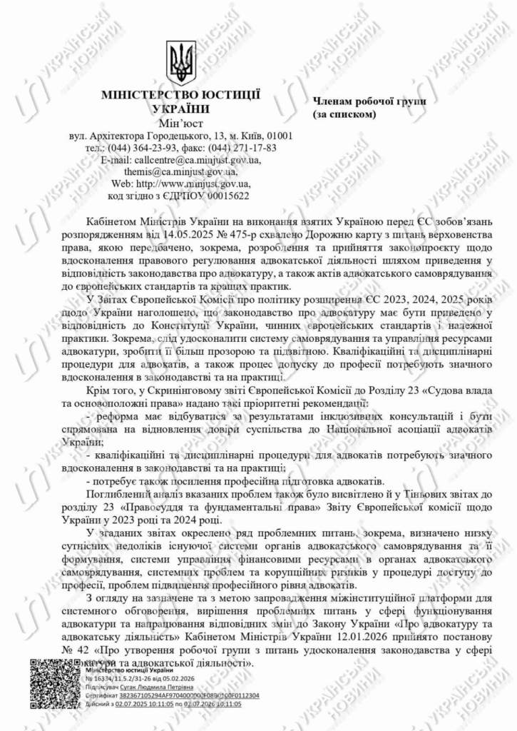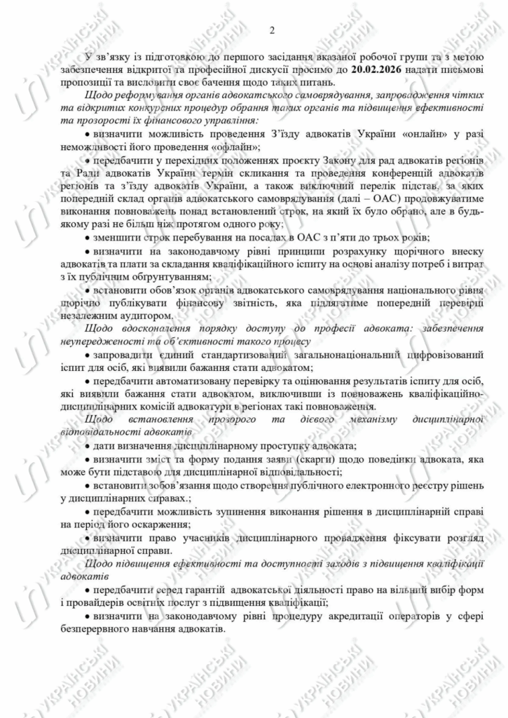 Наприкінці минулого тижня члени робочої групи отримали лист Мін’юсту з вимогою до 20 лютого 2026 року надати письмові пропозиції з широкого переліку питань — від “онлайн-з’їздів” і скорочення строків повноважень органів адвокатського самоврядування до цифровізованого іспиту та дисциплінарних процедур. Дату першого засідання Мін’юст пообіцяв визначити після узагальнення цих пропозицій. Формально — робочий процес. По суті — старт, який уже називають нелегітимним: тому що “реформа” починається з підміни інституційного представництва та нав’язування порядку денного до того, як робоча група взагалі узгодила правила роботи.
