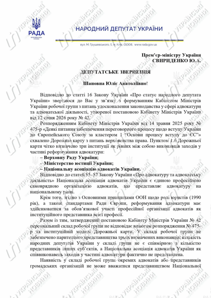 У депутатському зверненні до Прем’єр-міністра наголошено: НААУ відповідно до статей 55–57 Закону “Про адвокатуру та адвокатську діяльність” є єдиною професійною самоврядною організацією адвокатів, що представляє адвокатуру на національному рівні. А стандарти ООН (Основні принципи щодо ролі юристів, 1990) та підходи Ради Європи прямо виходять з того, що реформа адвокатури має відбуватися за обов’язкової участі професійної організації адвокатів як інституційного представника професії.