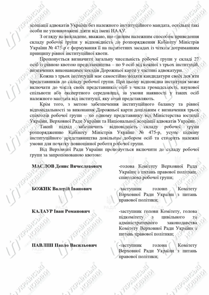 На перший погляд — логічно: підготувати матеріал до дискусії. Але в адвокатському середовищі та серед частини депутатів цей лист сприйняли як пакет “готових рішень”, для яких збирають формальні коментарі.