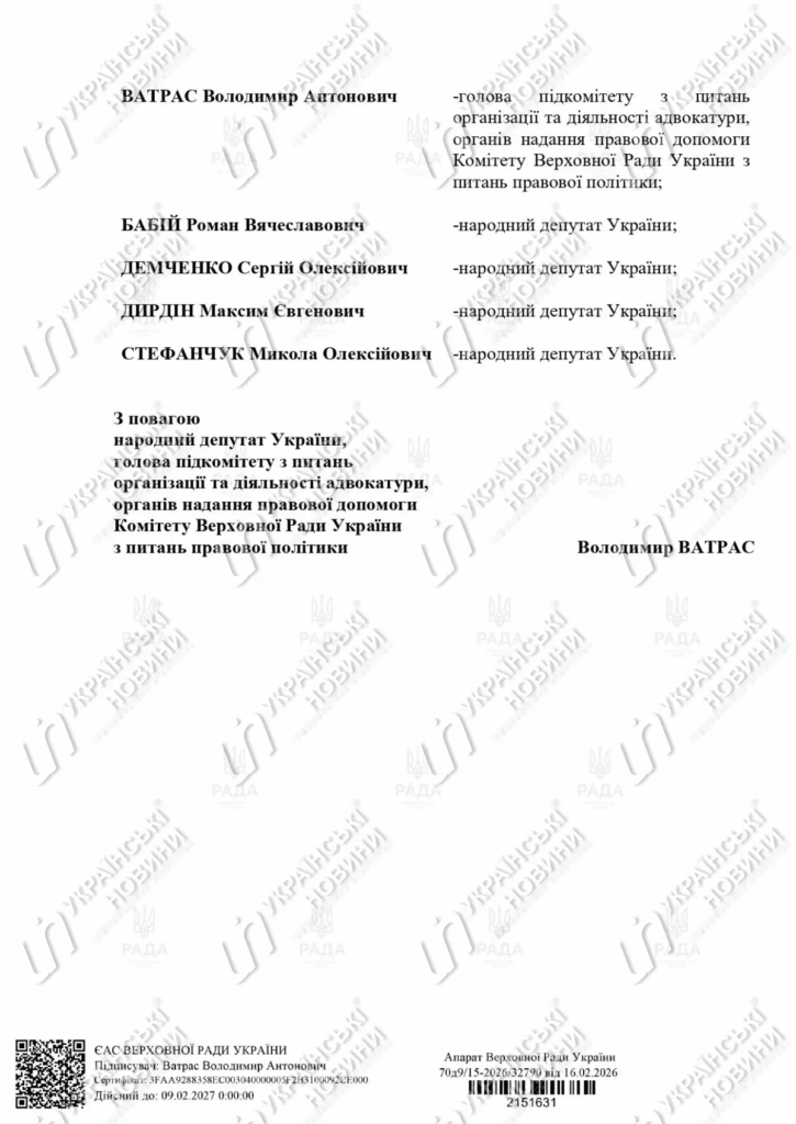 Того ж дня — 17 лютого 2026 року — свою позицію офіційно зафіксувала і Рада адвокатів України. Ухваленим рішенням вона констатувала відсутність належного інституційного представництва адвокатури у складі урядової робочої групи та звернулася до Кабінету Міністрів із вимогою переглянути її персональний склад.