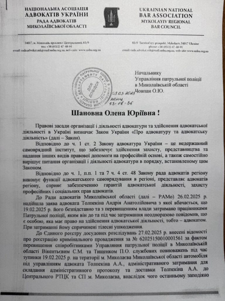 Рада адвокатів Миколаївської області звернулась до правоохоронних органів з прохання надати пояснення щодо затримання їхнього колеги Андрія Толпекіна.
