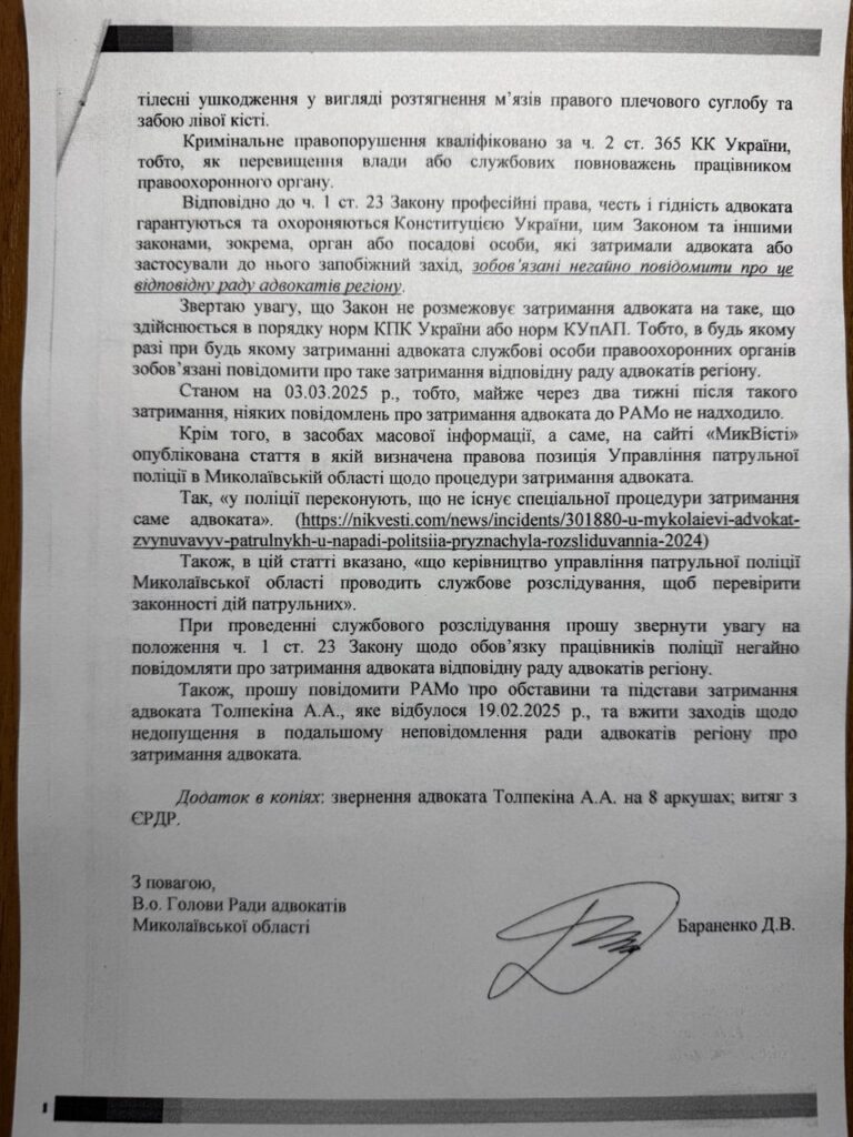 «Звертаю увагу, що Закон не розмежовує затримання адвоката на таке, що здійснюється в порядку норм КПК України або норм КУпАП. Тобто, в будь-якому разі при будь-якому затриманні адвоката службові особи органів Національної поліції зобов’язані повідомити про це затримання відповідну раду адвокатів регіону. Станом на 3 березня 2025 року, тобто, майже через два тижні після такого затримання, ніяких повідомлень про затримання адвоката до РАМО не надходило», — йдеться у зверненні.
