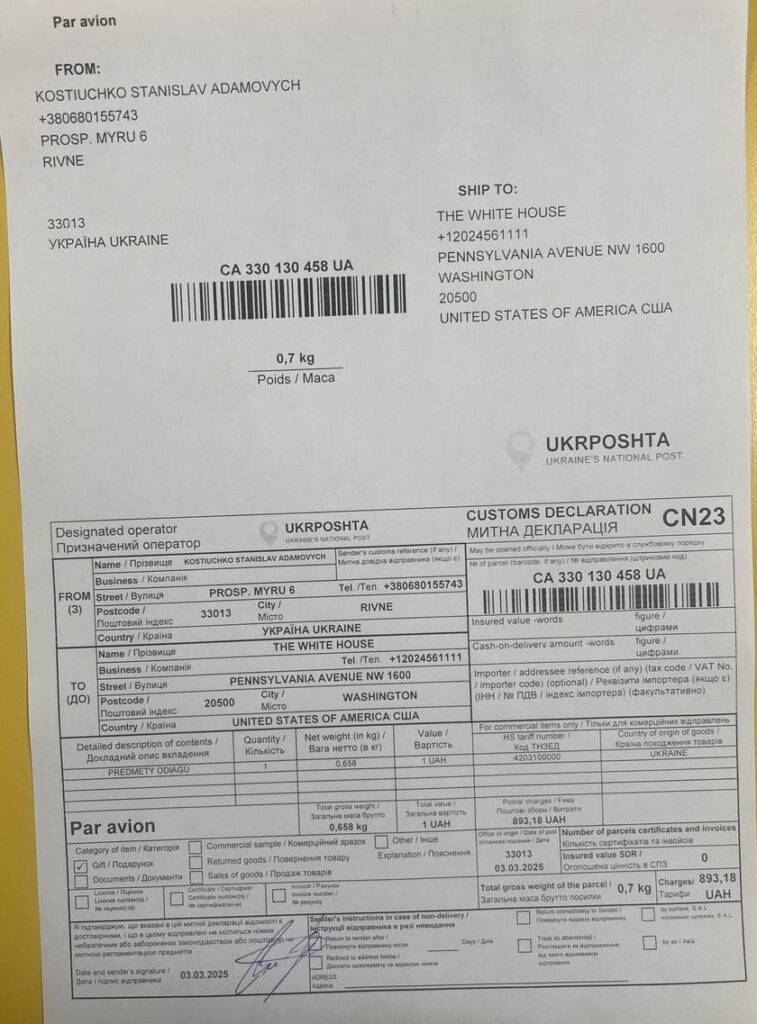 Рівненський адвокат Станіслав Костюченко відправив Дональду Трампу піджак.