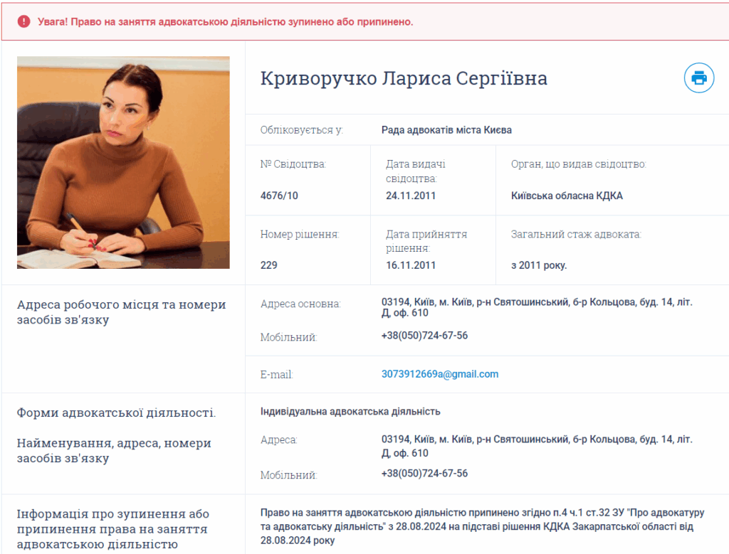 Профіль адвоката Лариси Криворучко у Єдиного реєстрі адвокатів України – https://erau.unba.org.ua/profile/24633