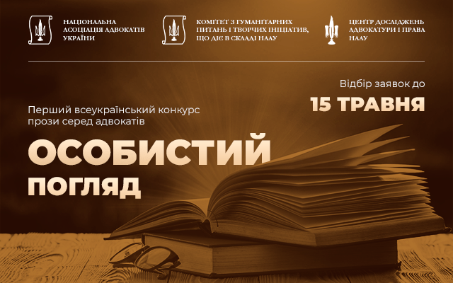 У НААУ триває збір заявок на участь у Першому всеукраїнському конкурсі прози “Особистий погляд”, що проводиться за ініціативою Комітету з гуманітарних питань і творчих ініціатив у співпраці з Центром досліджень адвокатури і права, повідомляє прес-служба Національної асоціації адвокатів України.