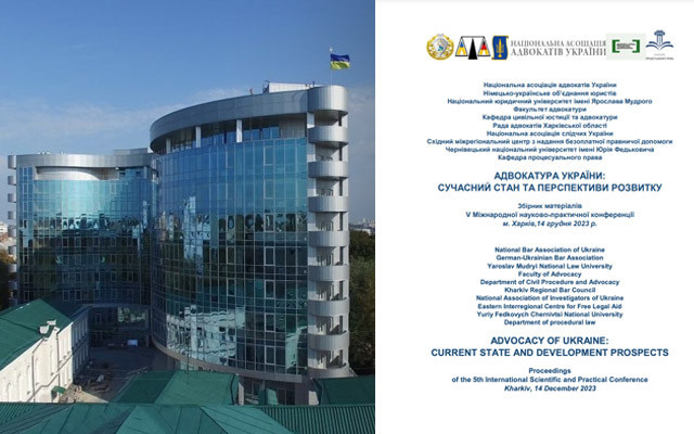 V Міжнародна науково-практична конференція «Адвокатура України: сучасний стан та перспективи розвитку» проводилася на базі факультету адвокатури та кафедри цивільної юстиції та адвокатури НЮУ разом з Національною асоціацією адвокатів України, радою адвокатів Харківської області, Німецько-українським об’єднанням юристів та іншими партнерами. Матеріали доповідей учасників рекомендовані до поширення самим організатором конференції.