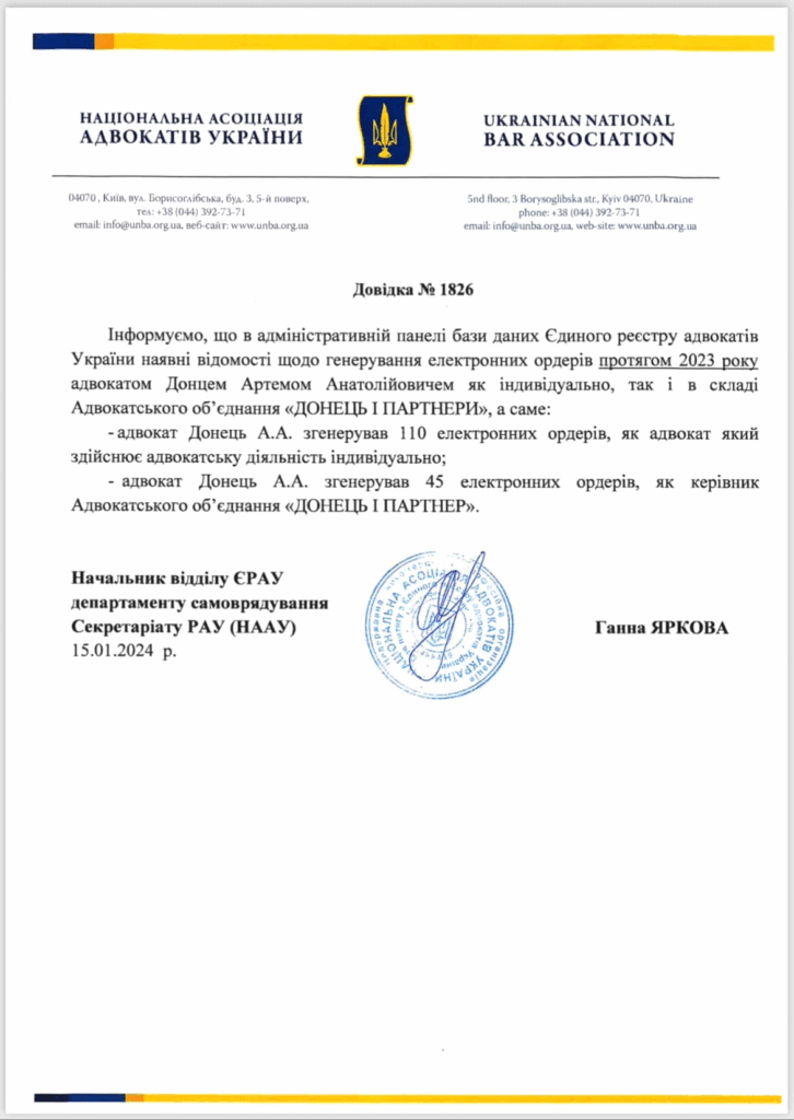 Ще одним підтвердженням порушення вимог закону є довідка від Національної асоціації адвокатів України про кількість ордерів, які адвокат Донець оформив лише під час 2023 року.